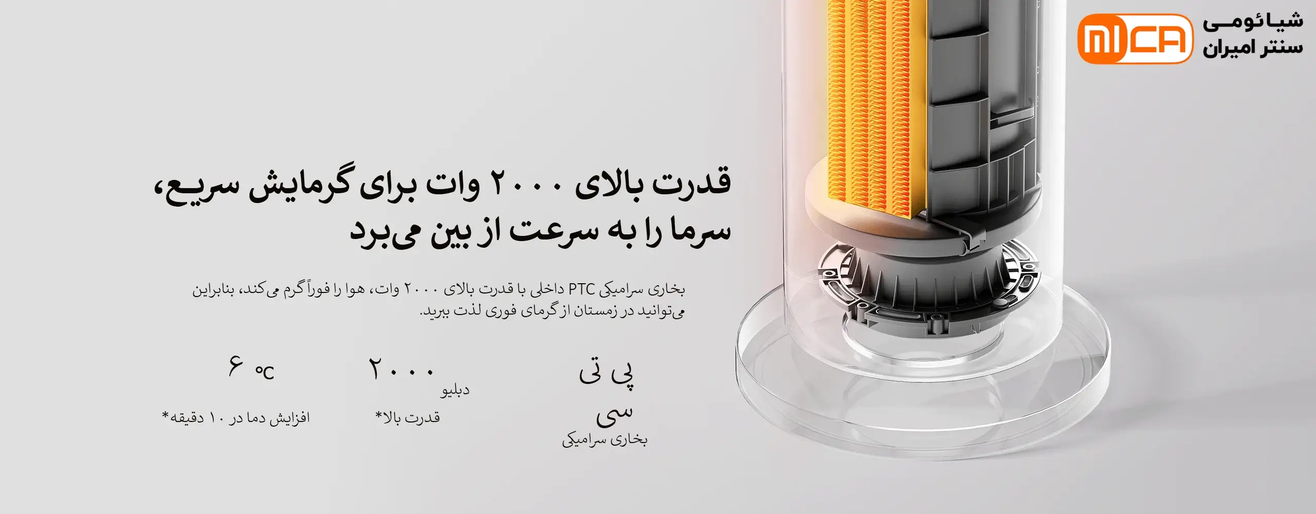 بخاری فن‌دار شیائومی با توان بالای ۲۰۰۰ وات، گرمایی فوری و یکنواخت را در عرض چند ثانیه به فضای شما می‌آورد. طراحی استوانه‌ای مدرن، فن سانتریفیوژ داخلی و زاویه تهویه ۷۰ درجه باعث می‌شود گرما به‌صورت گسترده و ملایم در محیط پخش شود.