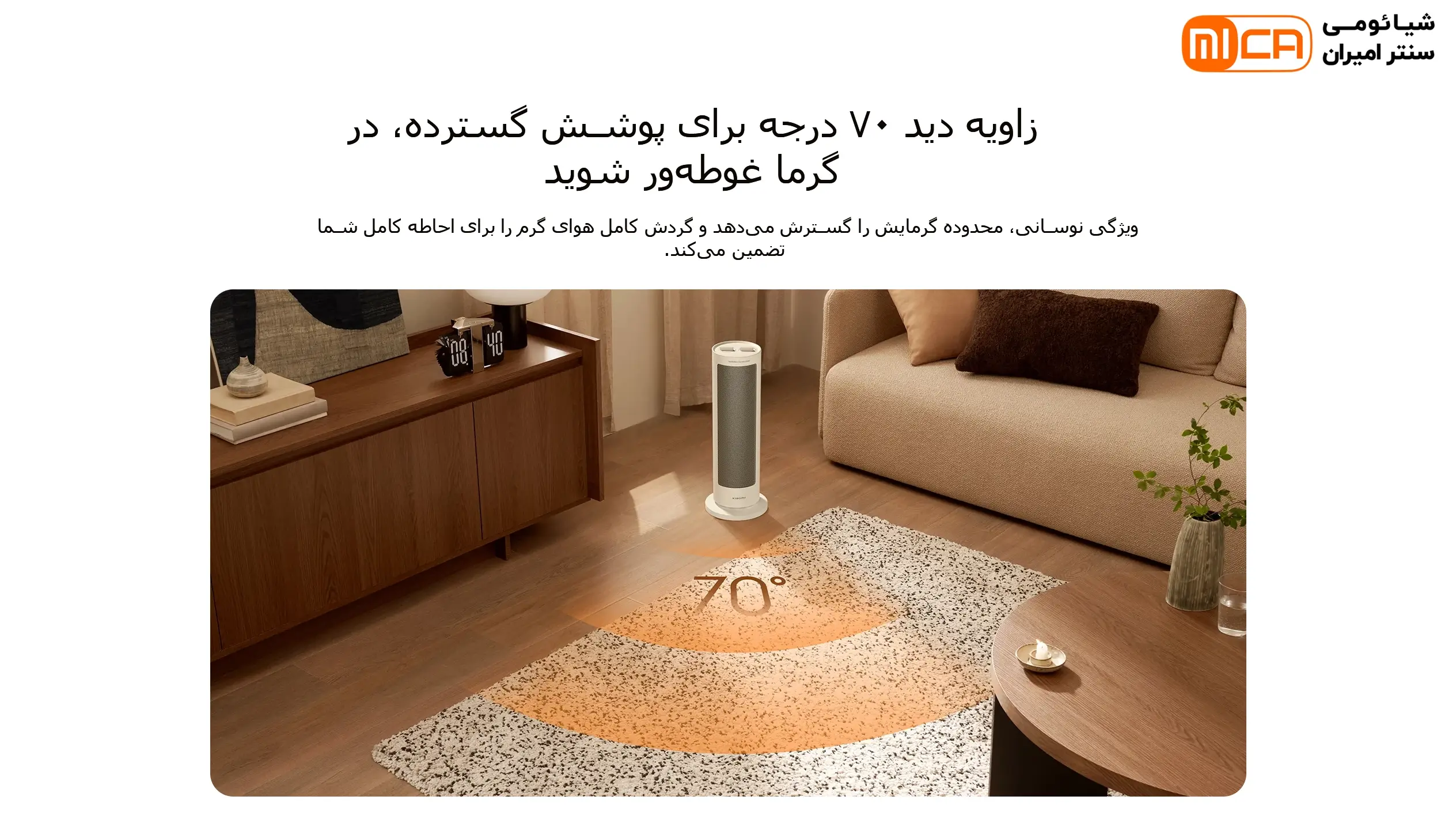 اگر به دنبال بخاری‌ای هستید که گرما را به‌صورت گسترده، یکنواخت و دلپذیر در فضای خانه پخش کند، بخاری شیائومی با نوسان ۷۰ درجه انتخابی هوشمندانه است. این دستگاه با ویژگی نوسانی، محدوده گرمایش را افزایش داده و با زاویه دید ۷۰ درجه، گرما را به‌صورت کامل در اطراف شما پخش می‌کند.