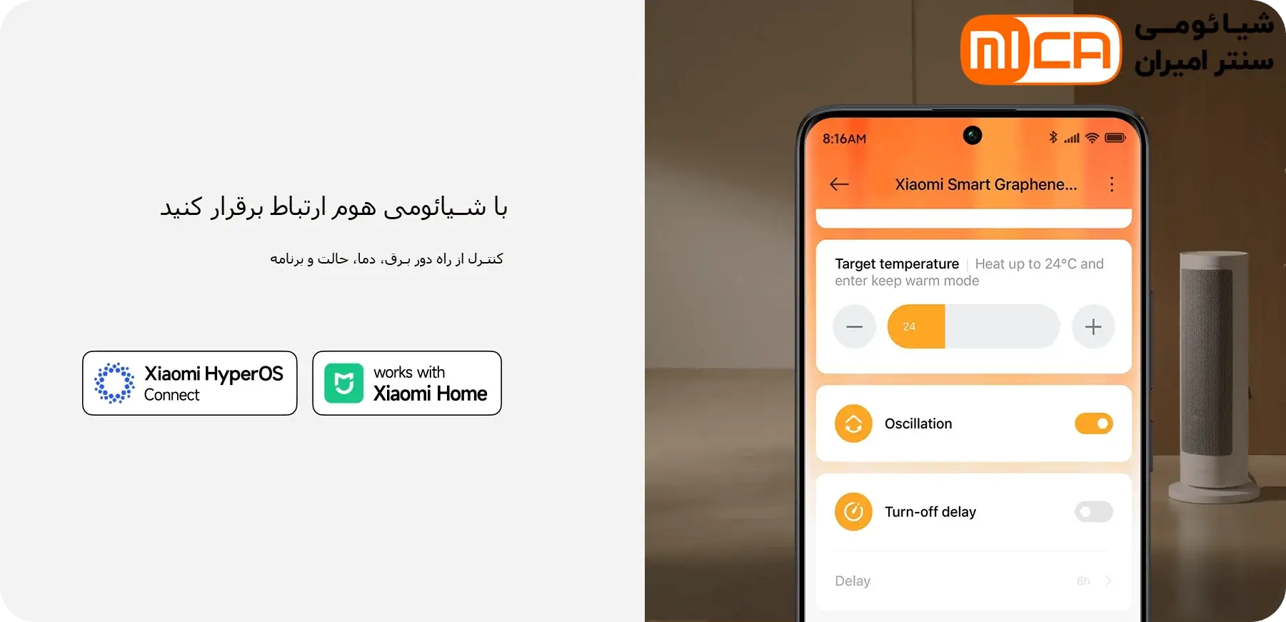 بخاری گرافنی هوشمند شیائومی با اتصال به اپلیکیشن Xiaomi Home و پشتیبانی از HyperOS Connect، امکان کنترل کامل از راه دور را برای شما فراهم میکند. از تنظیم دما تا انتخاب حالت گرمایش، نوسان، و زمانبندی خاموشی، همه چیز تنها با یک لمس در گوشی هوشمند شما قابل مدیریت است.